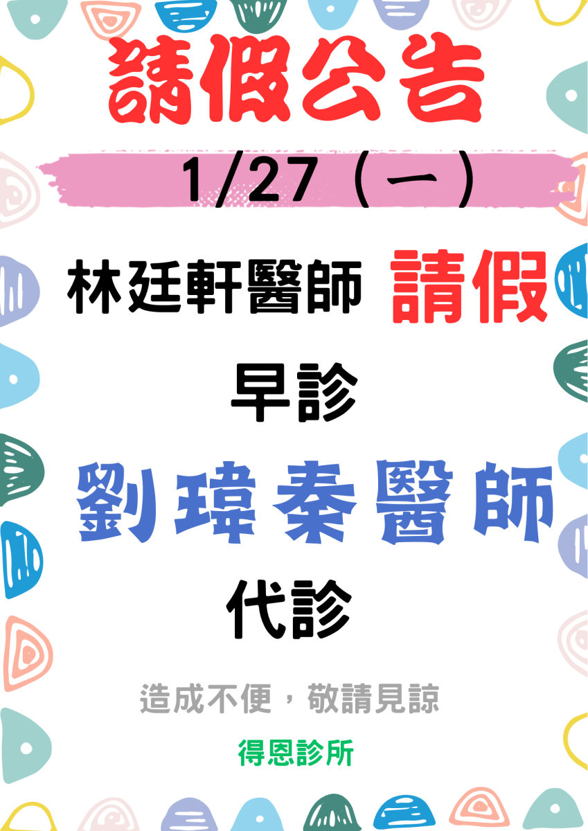 1/27(一) 林廷軒醫師早診請假,由劉瑋秦醫師代診。 造成不便,敬請見諒~ 得恩診所